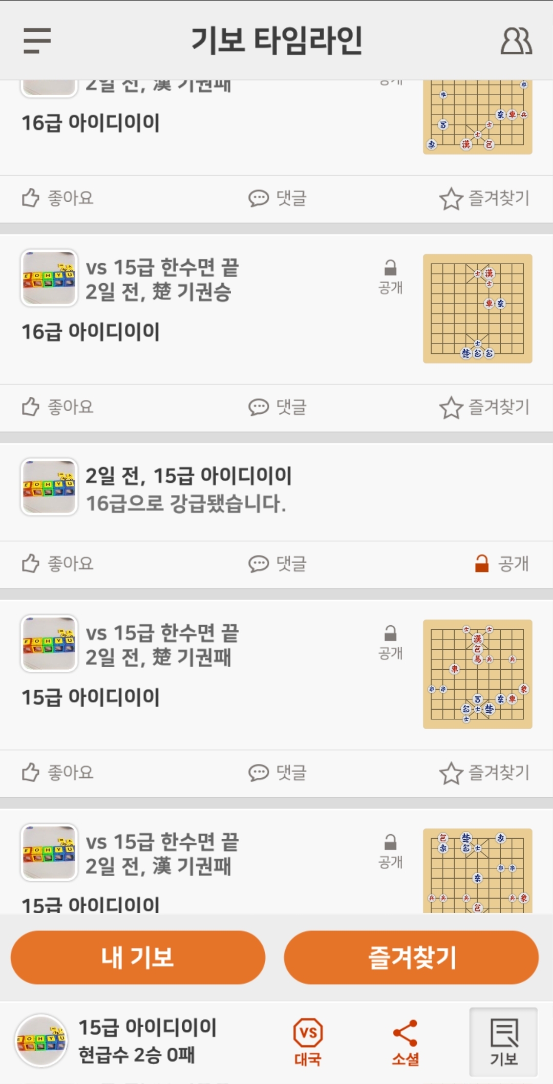 곧 그 친구를 만나러 가는 김에 장기 전적이나 조금 올려놓을까 싶어서, 오랜만에 장기 어플을 켰다. 그런데 내리 지는 것이다. 만회하려고 하다 보니 16급까지 내리 떨어졌다. 10급에서 3판 질 때마다 1등급이 떨어지니까 무려 18판이나 승리 없이 졌다는 뜻이다. 열받는 건, 떨어지는 와중에 다전제가 한 번도 없었다는 것이다. 운 나쁘게 고수를 만나서 훅 떨어진 것도 아니었다. 그날 기록을 보니 무려 5시간이나 플레이했었다. 다행히도 지금은 호구 하나 물어서 1승만 하면 14급에 갈 수 있게 되었다.