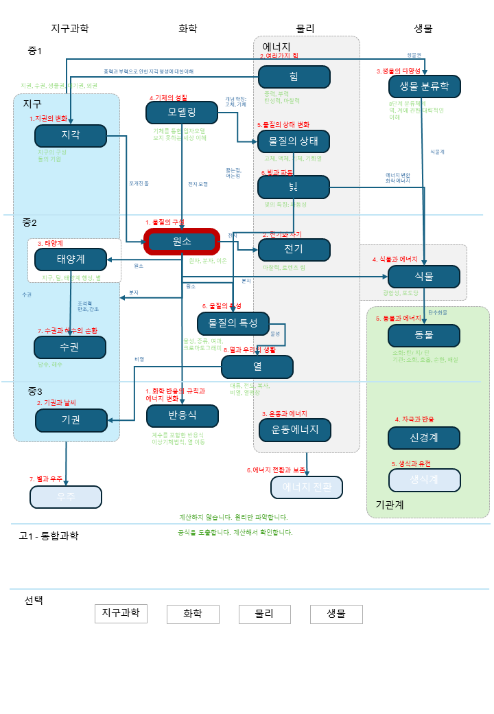 위는 전체적인 맥락이다. 단원을 끝낼 때마다 업데이트를 하고 있다. 그리고 아마도 2차 리뷰에서 또 달라질 것 같다. 마지막은 svg*로 보기 좋게 다시 그릴 생각이다. 단원 연계성을 가시화하는 데는 또 다른 이유가 있다. 과학교과는 교과대로 배우고, 과학도서는 도서대로 소비한다. 만약 중1이 모델링에 대해서 더 궁금한 내용이 있다면, 중2의 원소 부분을 보는 게 더 도움이 되지 않을까? 그리고도 성에 차지 않으면 중3의 반응식 과목을 보면 된다. 그리고, 그렇게 고3까지 가는 것이다. 기왕 공부하는 것 성적까지 잘 나온다면 1석 2조가 아닐까?