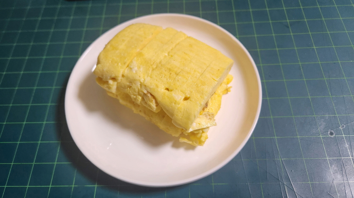 부드러운 계란말이는 일식조리사 실습 할 때 했던 메뉴였다. 달걀이 무려 6개나 들어간다. 모양이 박살이 났다. 처음에 대충 말아도 됐던 것 같은데, 아니었나보다. 팬에 있을 때는 더 처참했는데, 김밥말이로 억지로 모양을 잡았다.