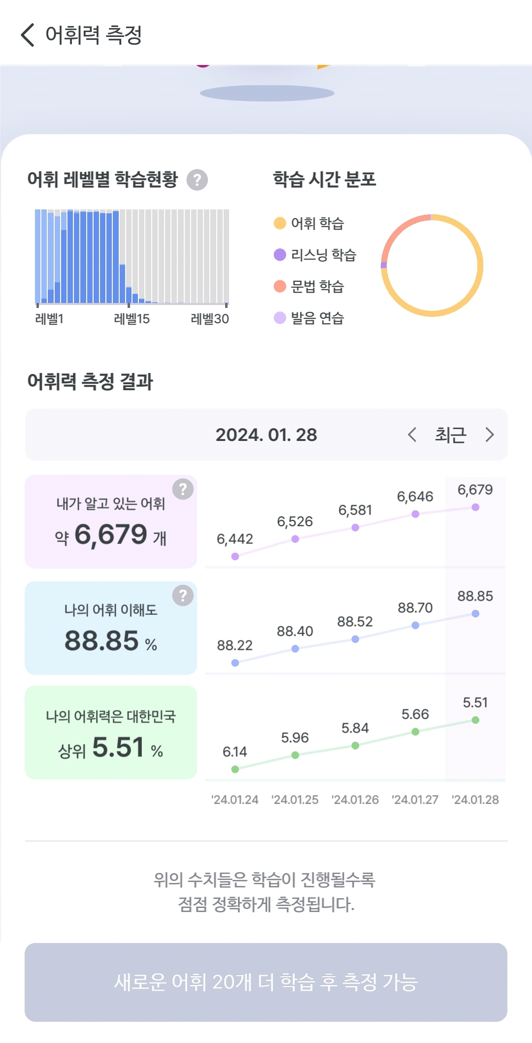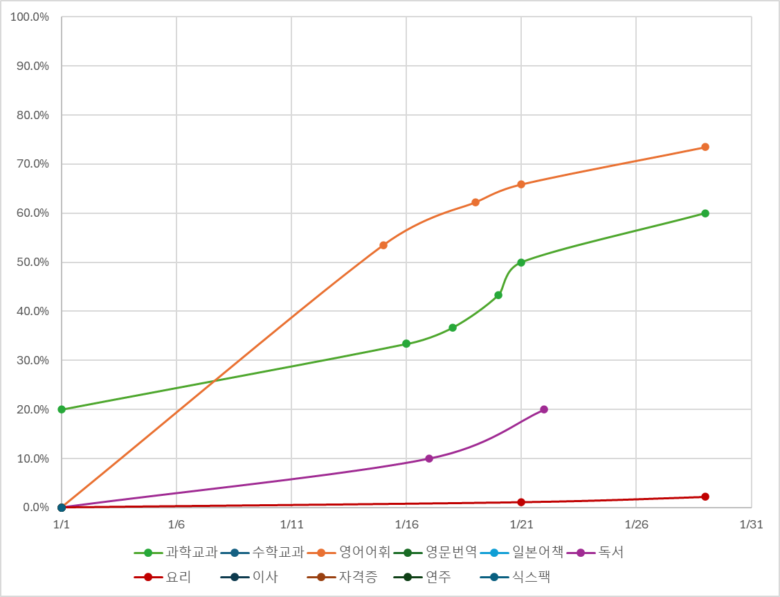 영어는 시간 투자는 똑같은데, 상대점수는 크게 늘지 않고 있다. 이제는 하루에 0.1%밖에 상승하지 않는다. 하지만 만족도가 꽤 높은 편이다. 이 속도라면 빠르면 4~5월도 가능하지 않을까 싶지만, 아무래도 점점 더 느려지는 것을 보면 안심할 수 없다. 사실 더 빨리 어휘를 늘리고 싶은 욕심이 없는 것은 아니다.