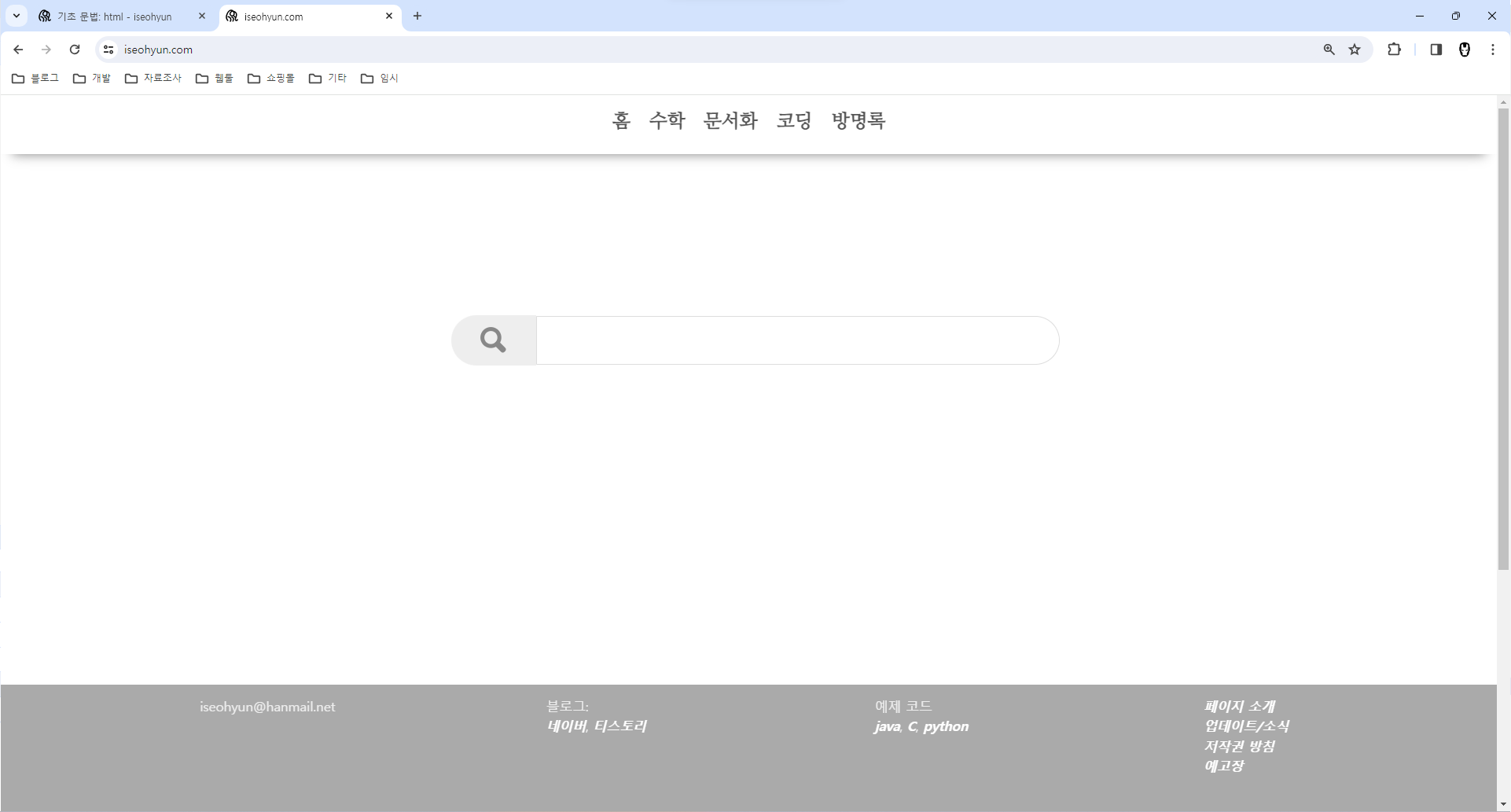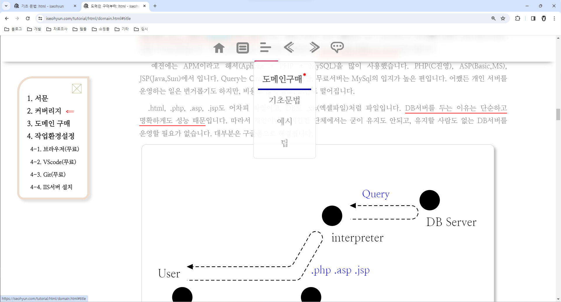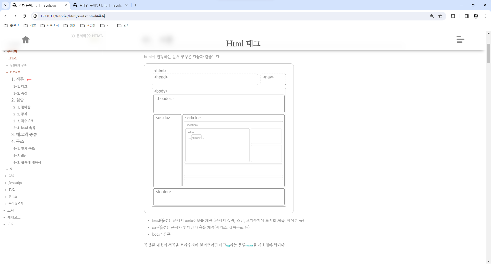 메뉴바를 통해서는 사이트 전체의 내용을 확인 할 수 있다. 그리고, 현재 폴더와 문서에 관해서는 목차도 확인이 가능하다.