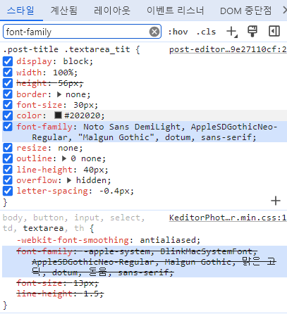 css파일들(보라색)에서 찾기(Ctrl + F)를 눌러 원하는 폰트를 검색. 하나씩 다 찾아봐도 되지만, 센스좋게 font.css또는 style.css 부터 검색하자. (남의 집에 가서 변기를 찾고 싶으면, 안방이나 서재부터 찾는게 아니고 화장실부터 찾는 이치랄까...)