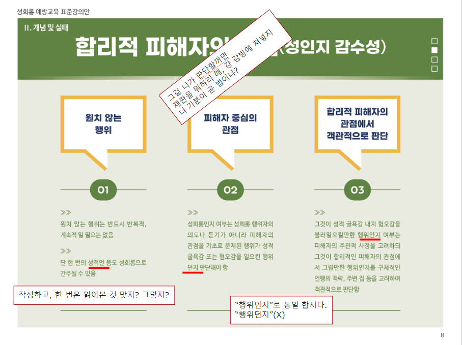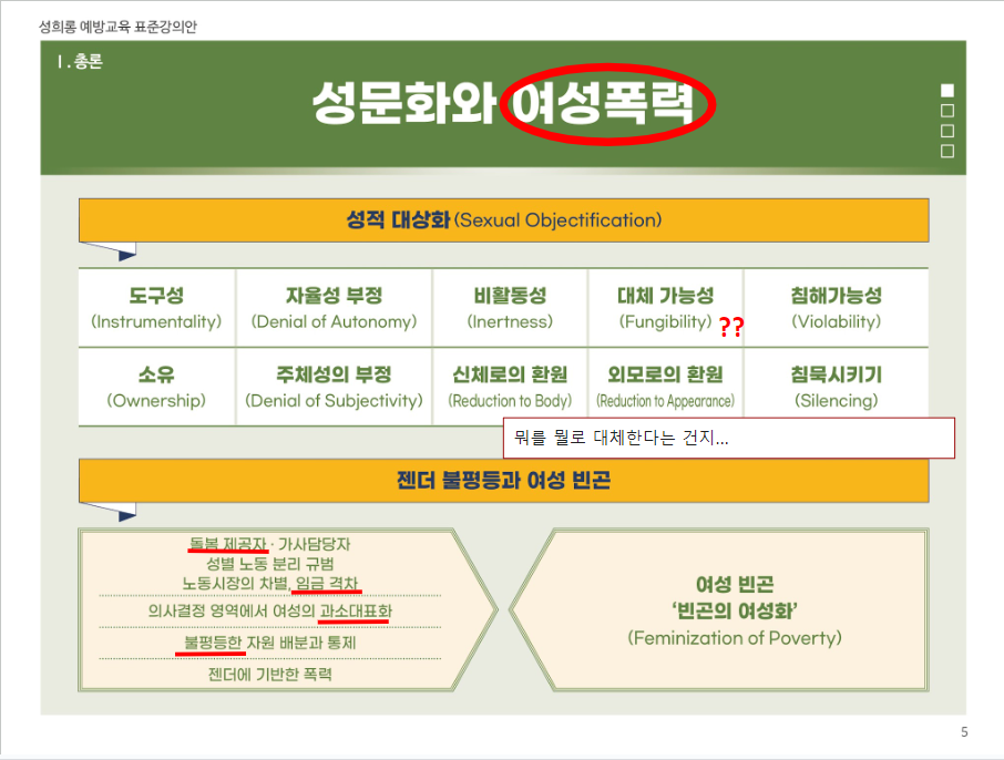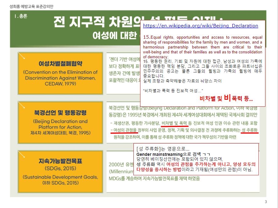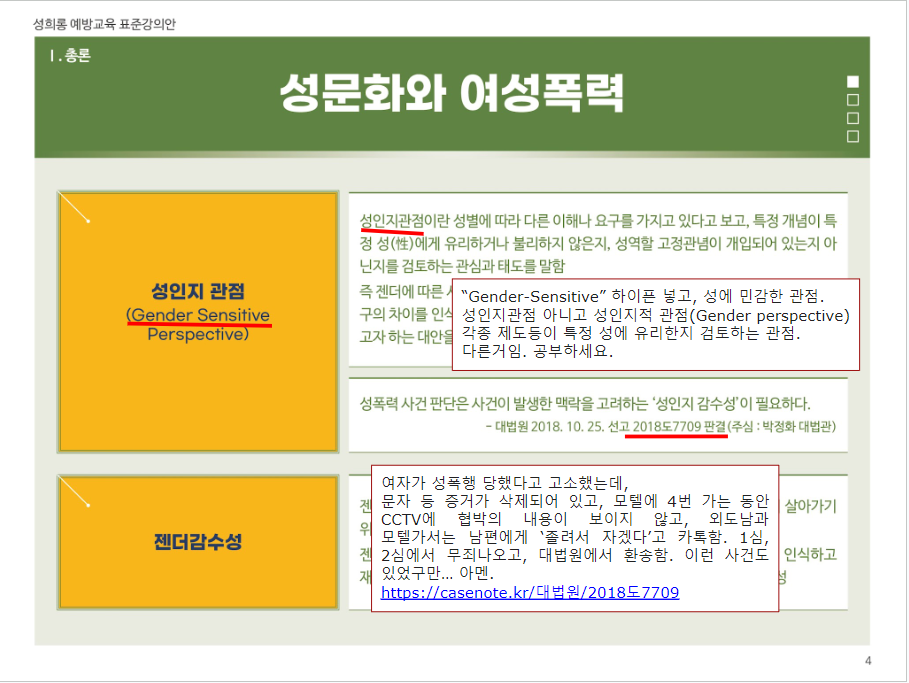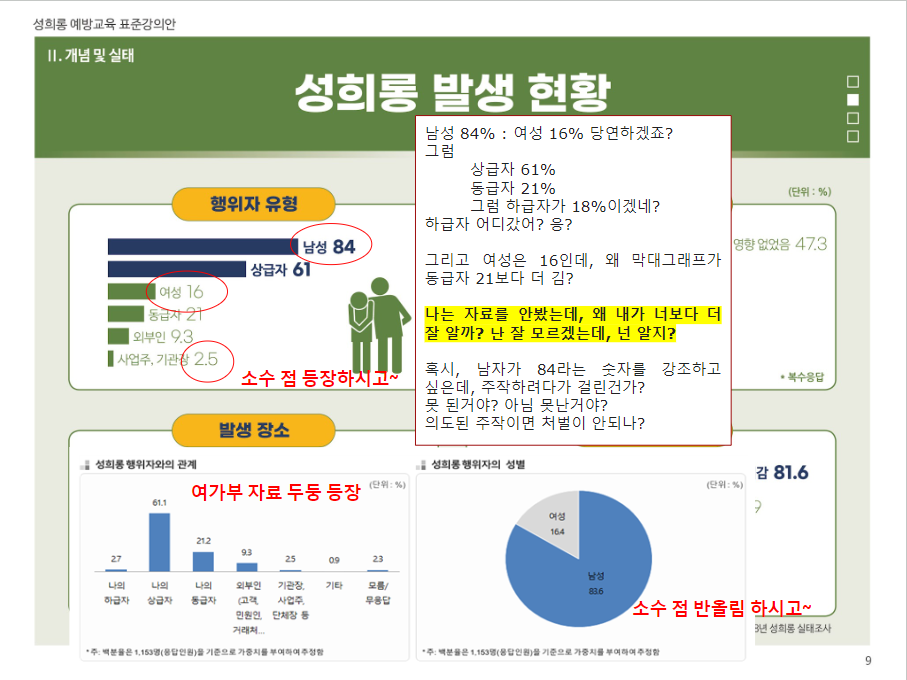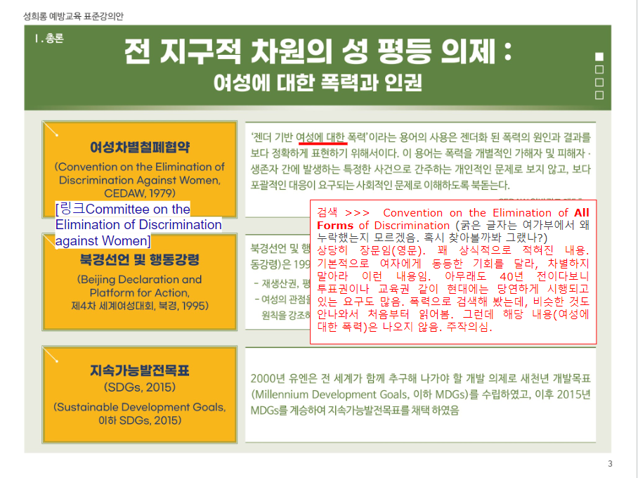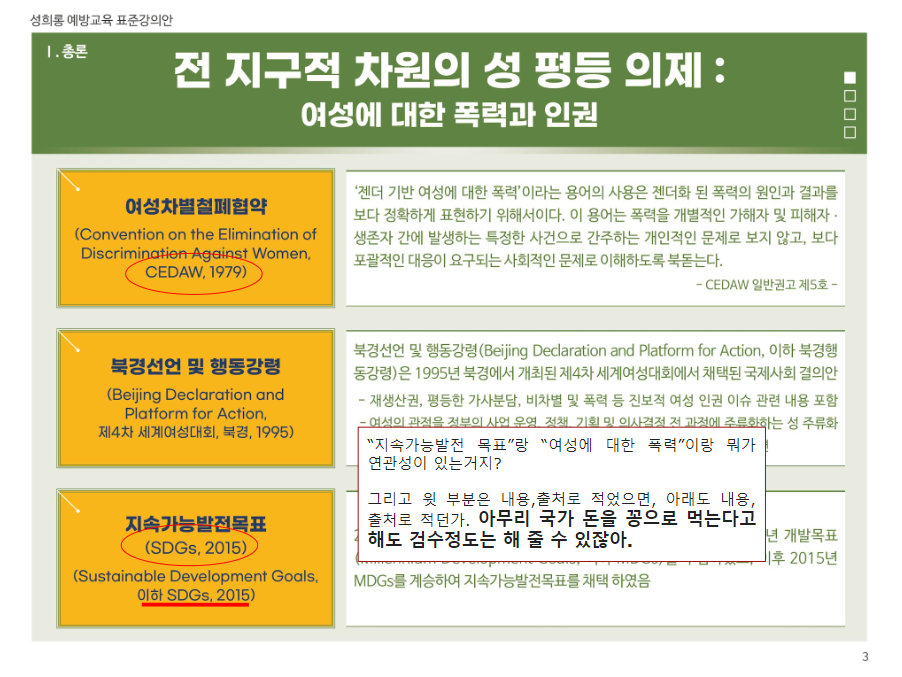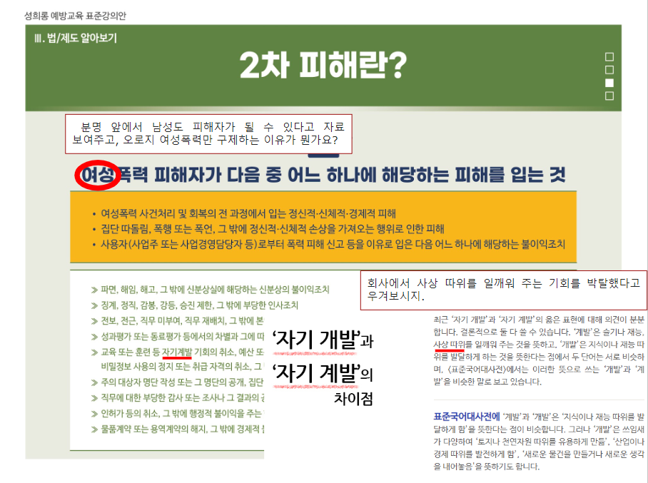 이들을 막아야 하는 이유는 여성폭력방지기본법[법령링크]과 같은 것에 있다. 제19조(여성폭력 예방교육)과 제20조(홍보)와 관련하여 자칭 전문가라고 하는 이들이 활동하게 되는데, 윤지선교수 한남충 논문[나무위키], 대전아동가족클릭닉센터[더위키]와 해바라기센터[나무위키]의 예시에서 보다시피, 성과에 눈이 멀어 어처구니없는 사회문제를 야기하고, 밥벌이 문제로 또다시 전문가라는 이름으로 해악을 끼치기 때문이라고 본다. 그러면 이들의 하이브 '여가부'의 공식자료를 보면서 대학생 1학년 ppt보다도 못한 완성도를 지적하고자 한다.