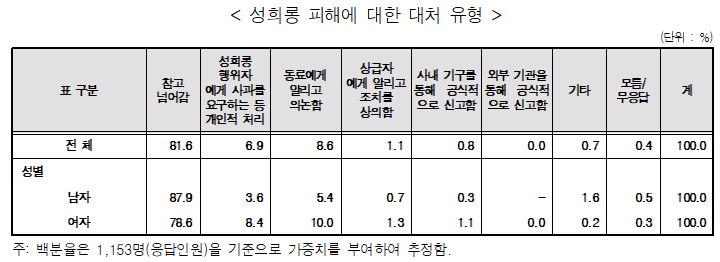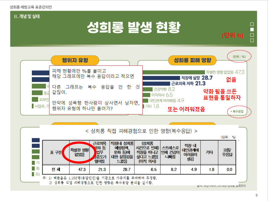 특별한 영향 없음이 47.3이 다른 항목과 양립이 불가능한 것을 볼 때, 문제를 일부러 확대 해석하기 위한 설문임을 알 수 있다. 52.7%를 71.4%로 늘려서 문제를 더 부각시키고 있다. 주석을 보면 성희롱 피해에 관하여 복수응답을 하였다고 시인하고 있다. 이렇게 노골적으로 통계를 작성해도 되는 건지 모르겠다. 통계청에 올라온 여가부가 작성한 수많은 설문조사들이 얼마나 돈 낭비였는지 실감하게 한다.