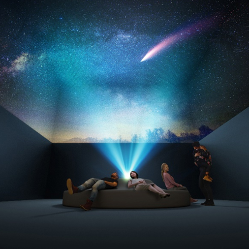 압도적으로 만족스러웠다. 과천 천체 투영관에 비하면 아담 사이즈이지만, 과천은 어린이 대상공연이라 톤이 밝기도 하고, 무엇보다 관람이 시작하면 의자를 눕혀주는데 어른에겐 좀 작아서 그런지 목이 편하지 않았었다. 그림에서는(좌) 목베게가 있는 것 처럼 나와 있지만 현장에서는 그냥 원형 소파라서 목베게가 없다. 이게 신의 한수라고 생각한다. 귀뚜라미 소리와 개구리소리, 그리고 모기 몇 마리만 넣어주면 GOP 소초라 해도 믿을 것 같다. 소파는 어른들이 둘러 누워도 될 정도의 크기이다. 공연이 생각보다 짧기도 하고, 사람들이 계속 들어와서 마냥 누워 있을 수는 없다. 천장에 탐지기랑 쿨러(?)가 보이는데, 이걸 없앴다면 더 완벽하지 않았을까? 벽에 설치한다던가 했다면 말이다. 교육용으로 쓰기에도 너무 좋을 것 같다.