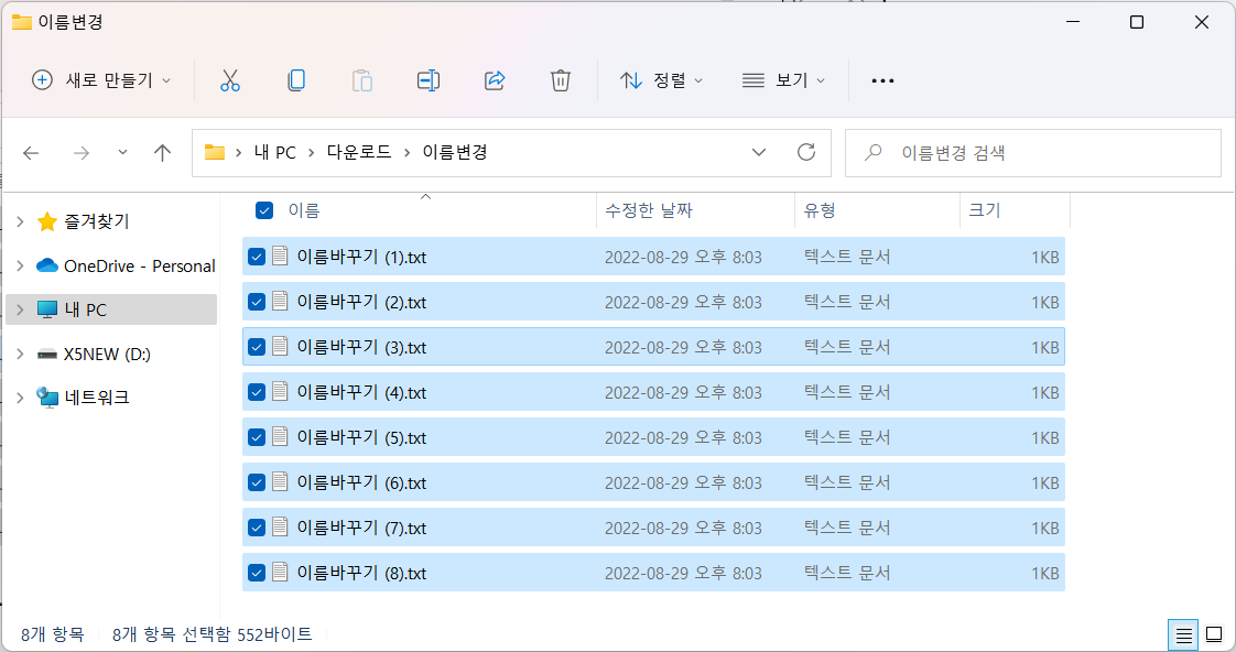 원하는 파일을 모두 선택한 후에 F2를 눌러서 이름을 변경하면, 새이름(1), 새이름(2)와 같은 형식으로 이름이 변경 됨.