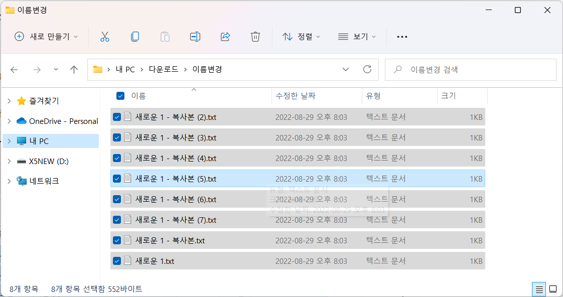 원하는 파일을 모두 선택한 후에 F2를 눌러서 이름을 변경하면, 새이름(1), 새이름(2)와 같은 형식으로 이름이 변경 됨.