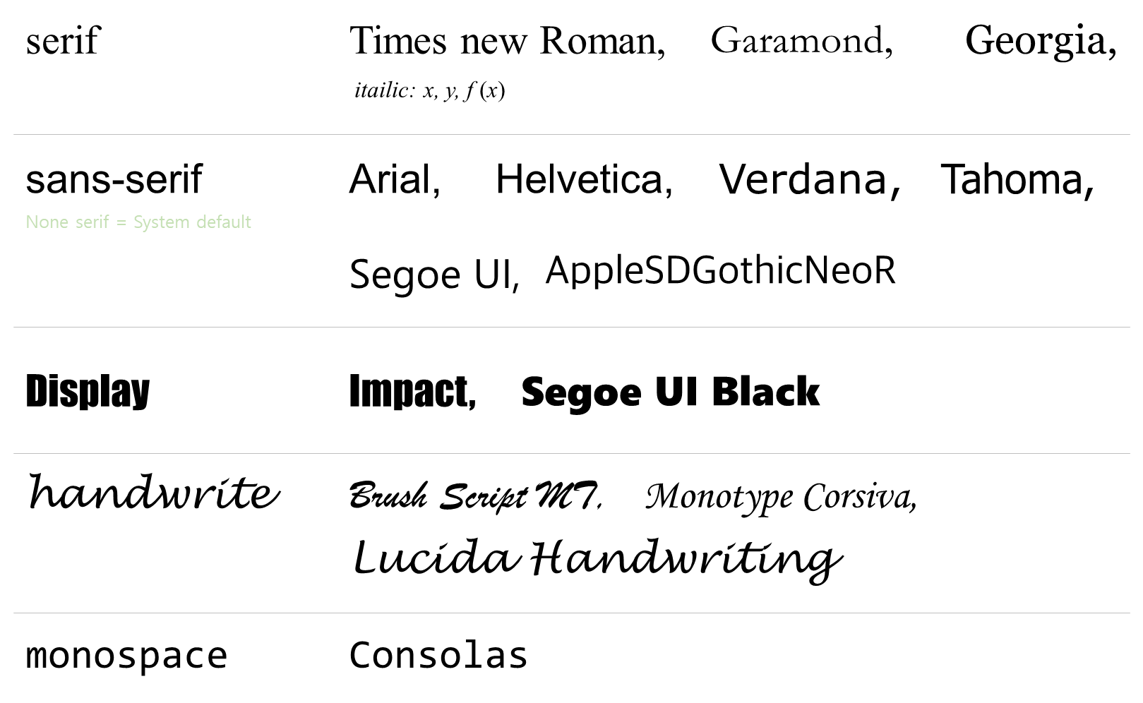 폰트 개요 폰트는 5가지로 분류(명조, 고딕, 헤드라인, 손글씨, 일정간격) MS, Google, Apple, 네이버에서 배포한 폰트가 주류 Google, 네이버는 무료 배포 폰트의 계보 폰트의 종류 계열명 국문 설명 seri